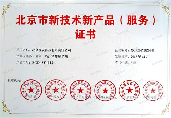 2017年12月,北京市科学技术委员会正式公布第七批北京市新技术新产品(服务)名单,视友科技Ego冥想脑波舱在新一代信息技术领域中成功入选。