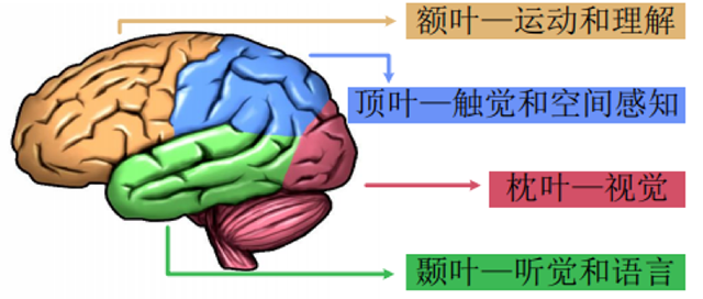 从生理上看,大脑的部位各有分工,不同皮层区域的感觉、运动、认知模块相互独立,如下图所示,但各个功能模块相互协作,形成一个有机的整体。在大脑处理感知信息的过程中,多种模块并行工作。基于SSVEP信号的BCI系统就是通过检测枕叶视觉区的EEG信号来判断大脑的思维活动。