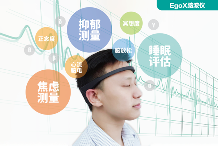 通过佩戴系统的便携式脑波仪Ego X脑环,它像一个一座桥梁,缔结起我们的大脑与系统,再通过脑电技术实时感知、测量大脑状态,系统“拆解”脑波信息,对我们此时此刻的疲劳、睡眠、焦虑等心理健康因素进行一系列的客观评估,形成详细的数据、图标信息。