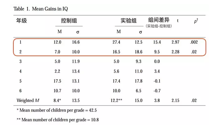 实验结果表中,M 是两次测试的差值(意味着 8 个月时间里孩子进步了多少)。统计检验显示,一二年级的实验组孩子比控制组有显著更大的进步