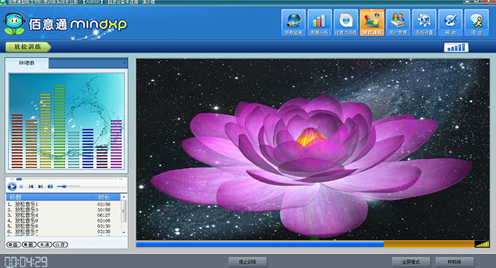 佰意通脑放松训练:集成音频播放器,支持自定义添加脑波放松音乐,支持音乐反馈控制和图像反馈控制等多种反馈模式。支持训练结果的统计分析,可设置统计分析区段,并以曲线图、柱状图、饼图等图表形式显示分析结果;支持训练效果评价,并自动生成报告,提供报告导出功能。支持多用户管理及训练记录管理,可查询和导出训练记录;支持使用思语脑波灯进行脑电反馈训练。