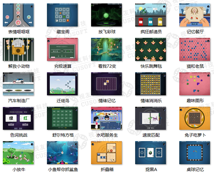 除了“冰岛救援”,视友科技的“大脑360认知能力与心理健康脑电测训系统”还有其他众多针对“脑能力提升”的游戏训练:藏宝阁、小放牛、猫和老鼠、记忆餐厅……都是让我们能在快乐中,不知不觉地进行脑认知、脑电生物反馈、注意力训练和脑放松训练。